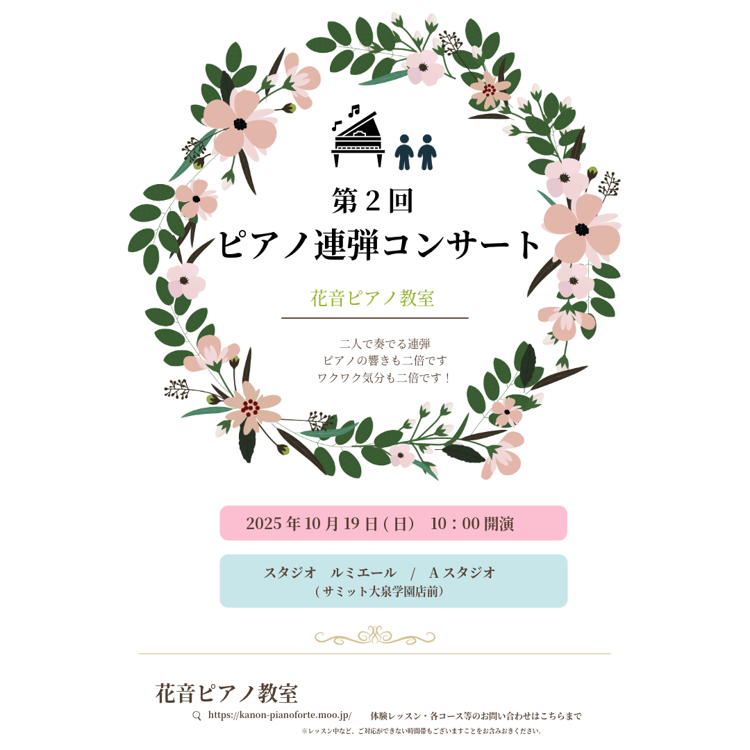 同じ曲を弾いてもいいですし、別の曲をそれぞれお持ちいただいても結構です。連弾も出来ますね。